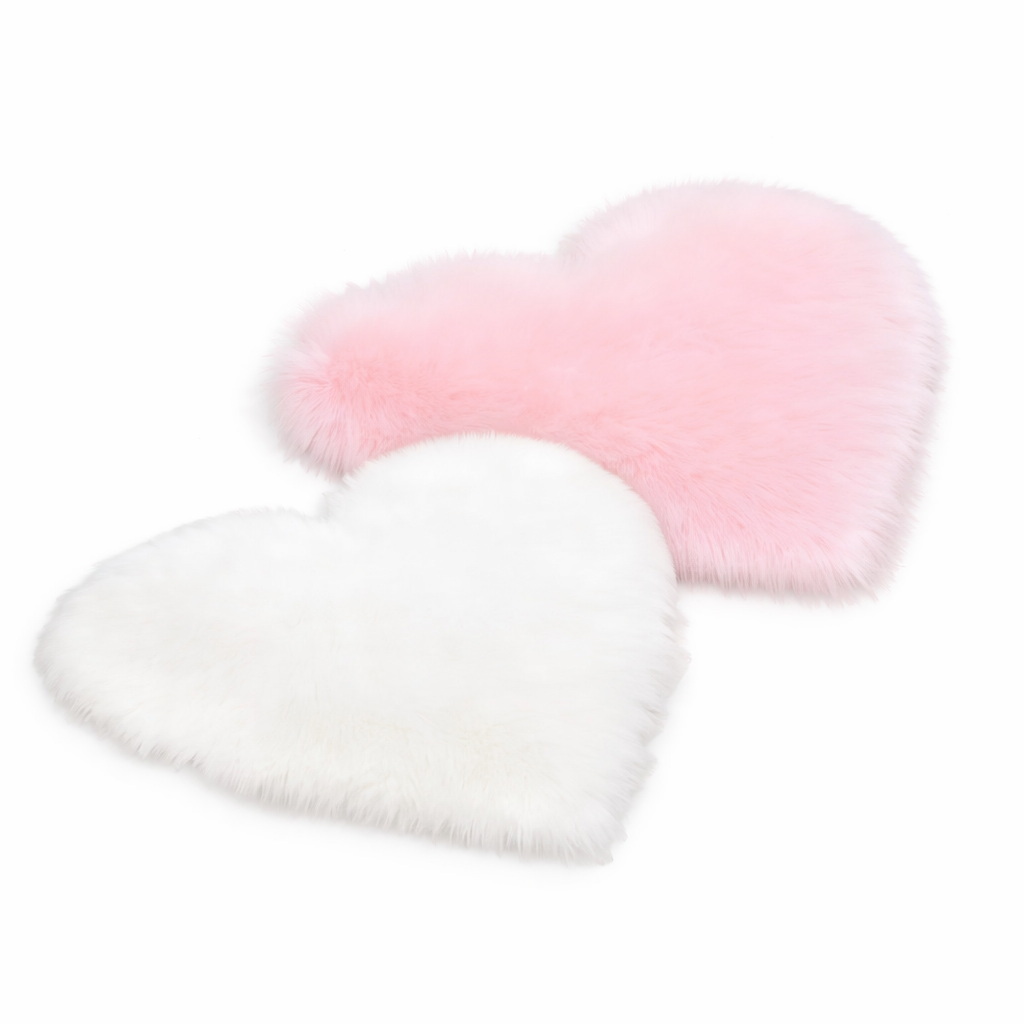 Der flauschige Teppich in Herzform ist erhältlich in den Farben Rosa und Weiß. Die Größe beträgt 40 x 50 cm oder 60 x 70 cm.